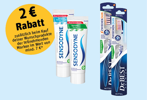 * Artikel im Wert von 7€ kaufen und 2€ Sofortrabatt erhalten. Der Rabatt wird automatisch an der Kasse abgezogen. Nur gültig auf Artikel der Marken SENSODYNE, SENSODYNE PROSCHMELZ, Dr. BEST, Odol-med3, Odol, parodontax und/oder COREGA. Keine Bargeldauszahlung möglich und nur einmal pro Einkauf einlösbar. Nicht mit anderen Rabattaktionen kombinierbar. Reisegrößen und Promo-Packs sind von der Aktion ausgeschlossen.