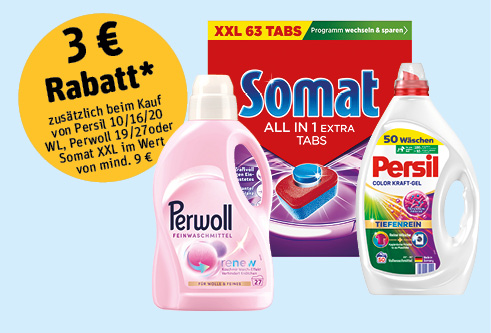 (WL ab -.25)3 € Rabatt zusätzlich beim Kauf von Persil 10/16/20 WL, Perwoll 19/27oder Somat XXL im Wert von mind. 9 €4.99